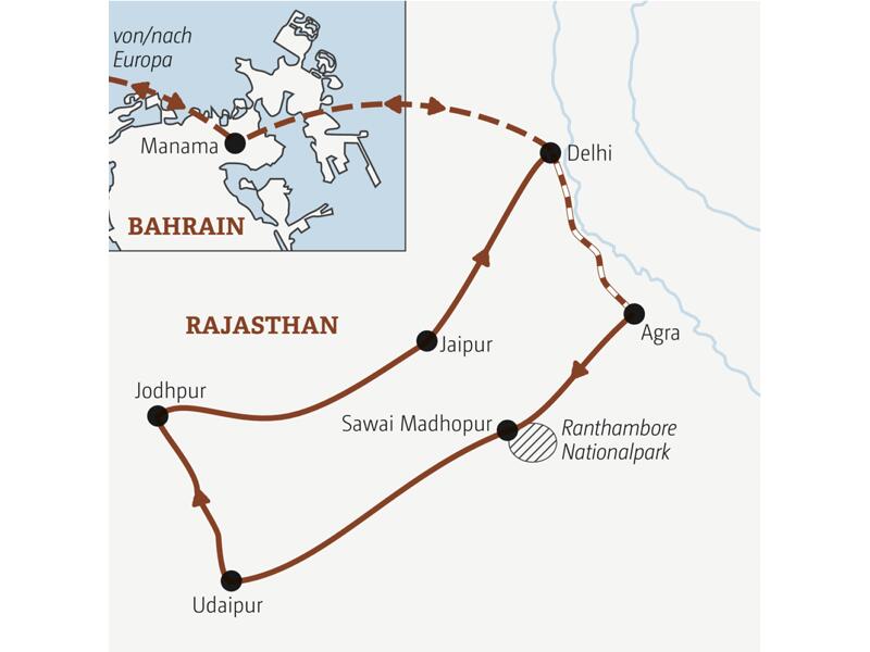 Sagenumwobenes Dilmun-Reich und historisches Zentrum der Perlenfischerei – wir entdecken Bahrains lange Geschichte und tauchen ein in die spannende Gegenwart. In Delhi, Udaipur und Jaipur schlägt unser Scout die schönsten Seiten des indischen Bilderbuches auf. Wir erleben Prachtbauten aus der Mogulzeit, prunkvolle Paläste, die Weite der Wüste und Frauen in leuchtend-bunten Saris. In Agra bewundern wir das märchenhafte Taj Mahal, das schönste Denkmal einer großen Liebe, im Ranthambore-Nationalpark begeben wir uns auf Tigerpirsch.
