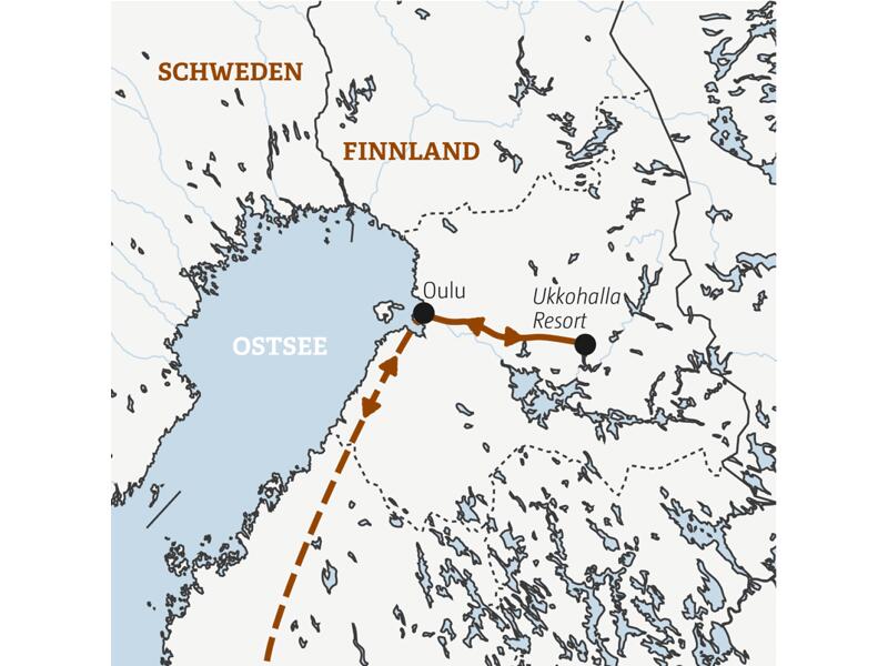 Linienflug von Deutschland nach Oulu. Abholung am Flughafen und Transfer zu Ihrer Unterkunft in Ukkohalla inmitten der finnischen Wildnis. Die Fahrt geht durch weite Landstriche mit Hügeln und Wäldern. Von Zeit zu Zeit passieren wir ein Dorf, doch insgesamt herrscht hier Einsamkeit vor.