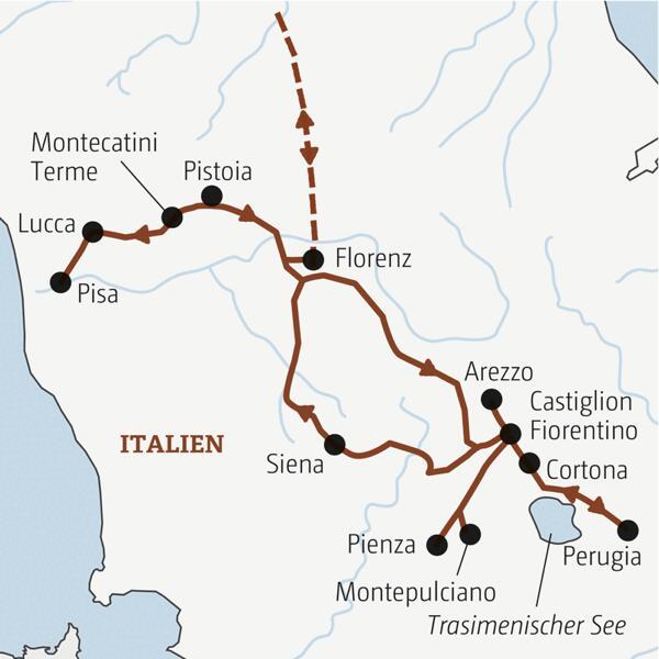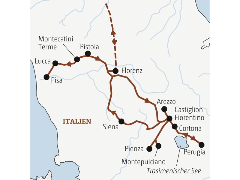 Domkuppeln und Palazzi, Olivenhaine und Zypressen – unzählige Postkartenmotive! Auf unserer Entdeckungsreise in einer der schönsten Regionen Italiens erkunden wir bekannte Orte wie Pisa und Siena, lassen uns von Pistoia und Arezzo faszinieren und unternehmen einen Abstecher an den Lago Trasimeno im benachbarten Umbrien. Wir sind zu Gast auf zwei Weingütern, und es bleibt Zeit, sich selbst ein Bild zu machen von den verborgenen und weltberühmten Schätzen der Toskana. Wer möchte, kommt am freien Entdeckertag mit nach Florenz.