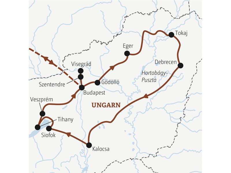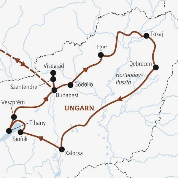 Unsere Entdeckungsreise durch Ungarn beginnt im lebhaften Bu-dapest mit seinen Jugendstilbauten und prächtigen Brücken. Liebliche Landschaften erwarten uns am Donauknie sowie in den Weinbergen rund um Tokaj, im Schloss von Gödöllö wandeln wir auf Sisis Spuren. Wir genießen eine Kutschfahrt durch die romantische, endlose Weite der Puszta, probieren lokale Traditionsküche und lassen die Reise am Ufer des Balatons ausklingen.